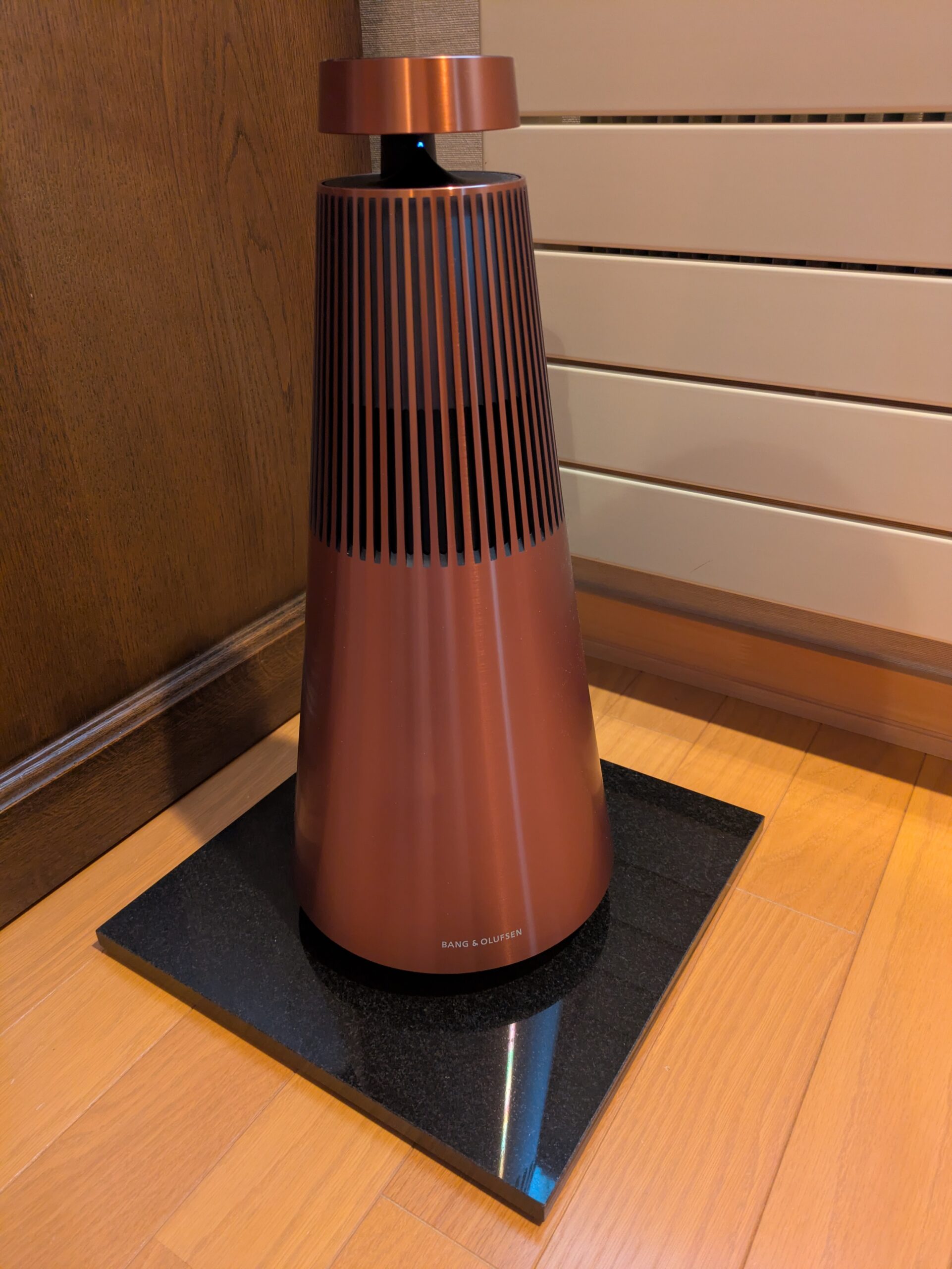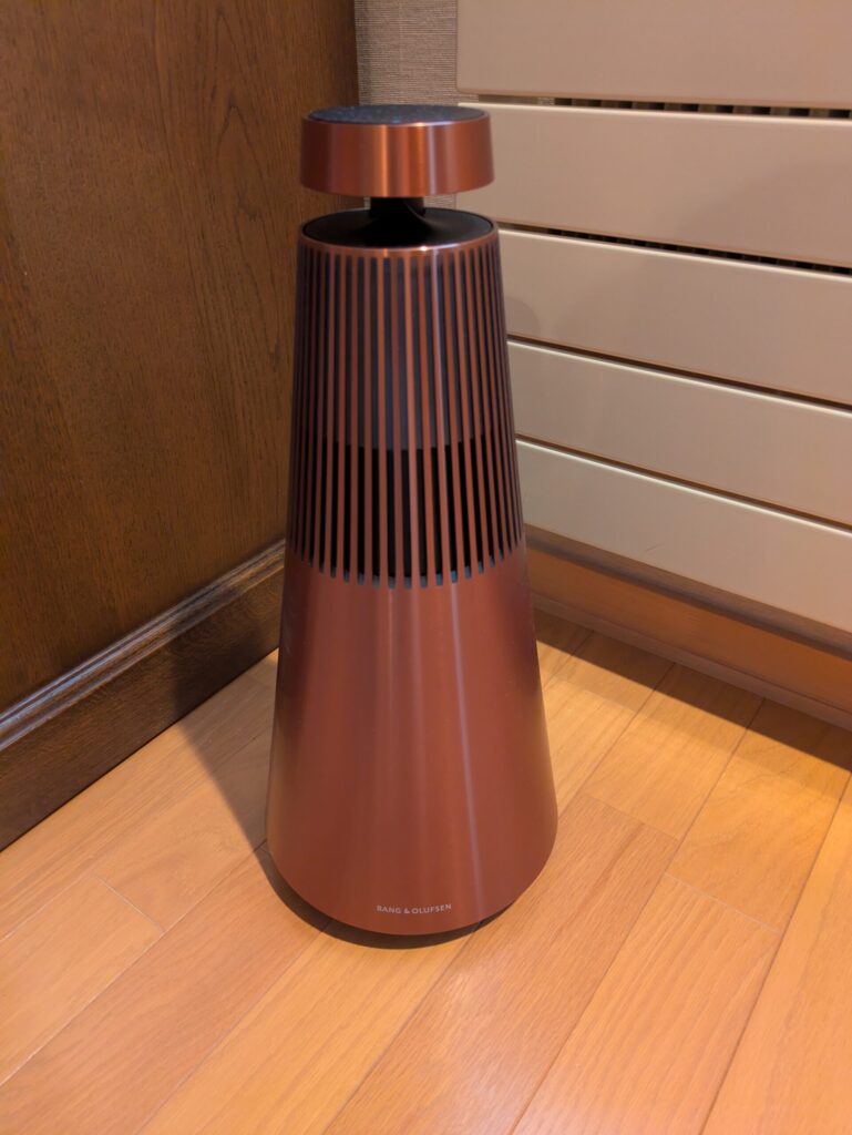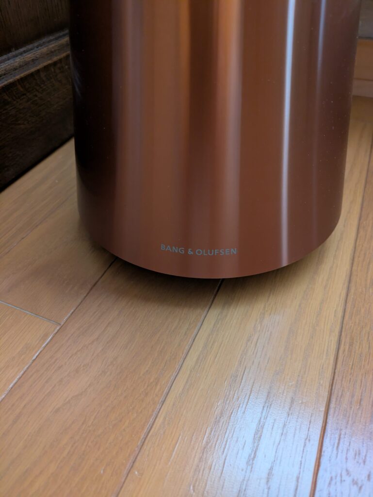 このBang&Olfsenのスピーカー は、社長の指示を受け、私が選定のうえ承諾をいただいたものであり、個人的にも思い入れのある機器です。