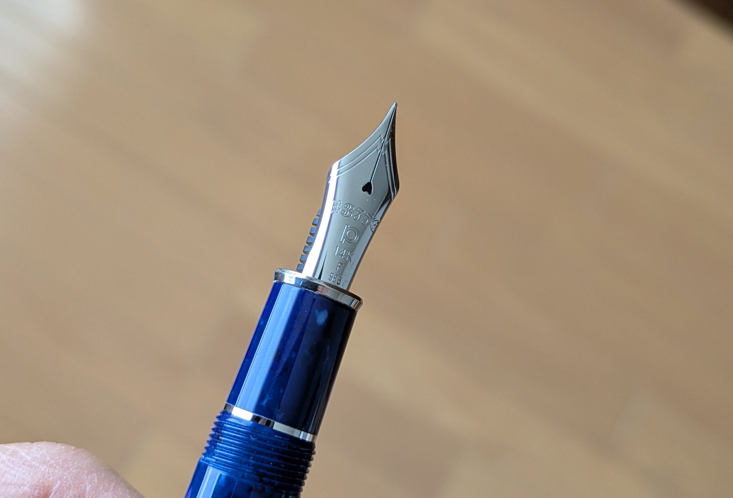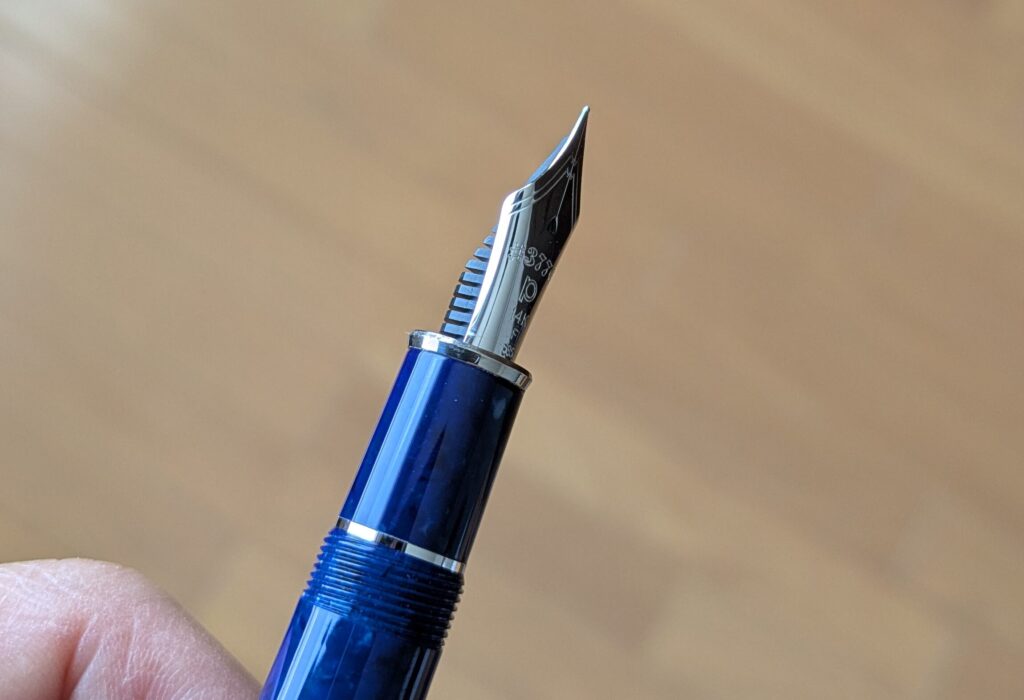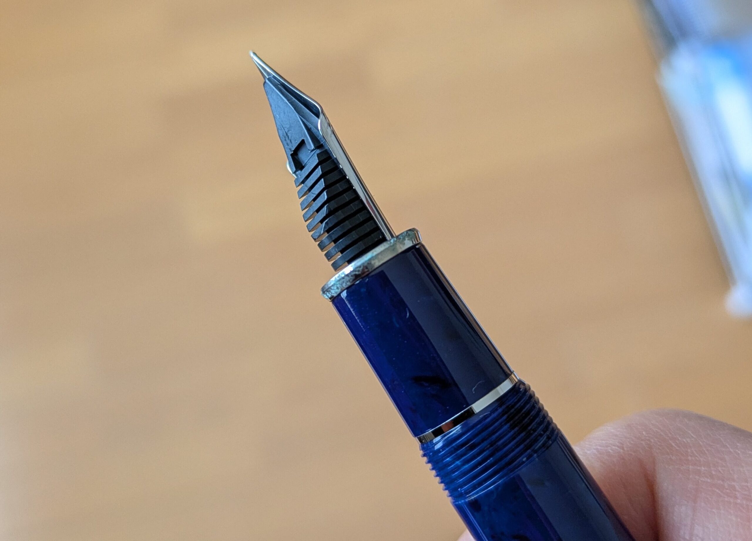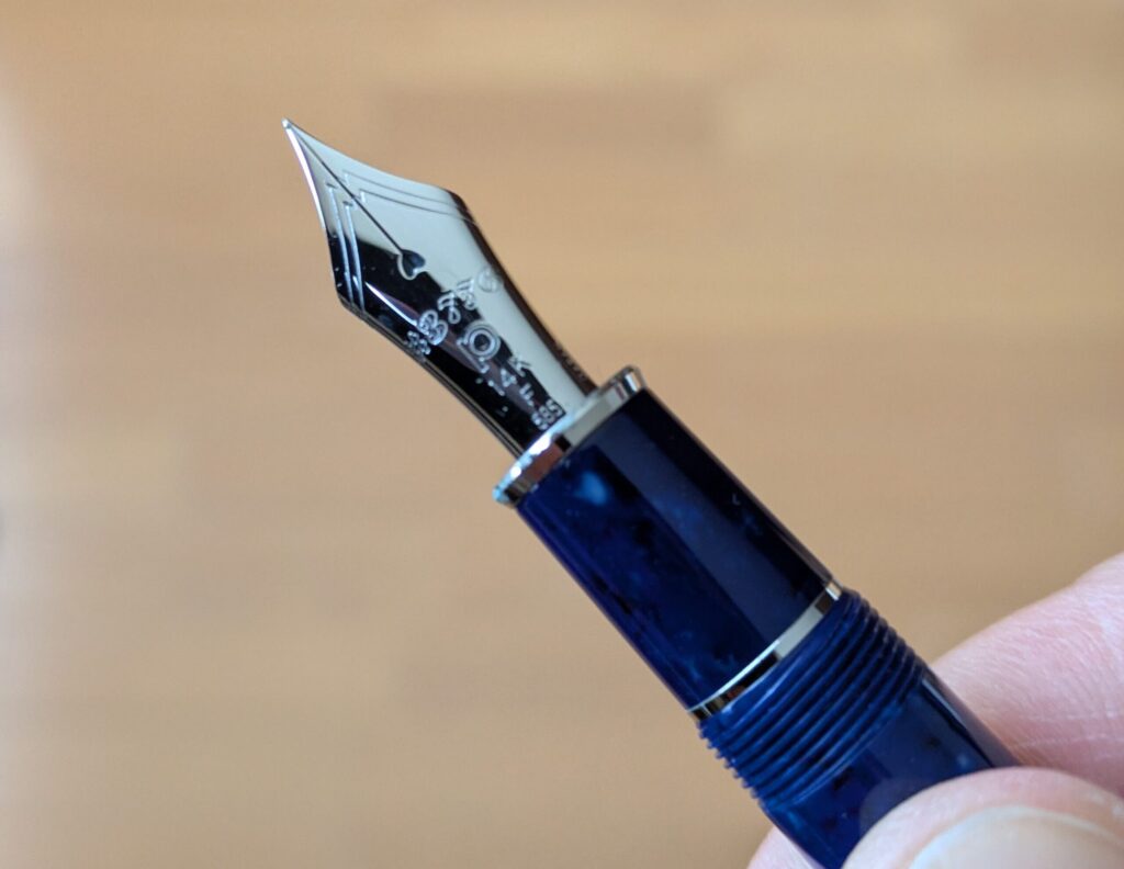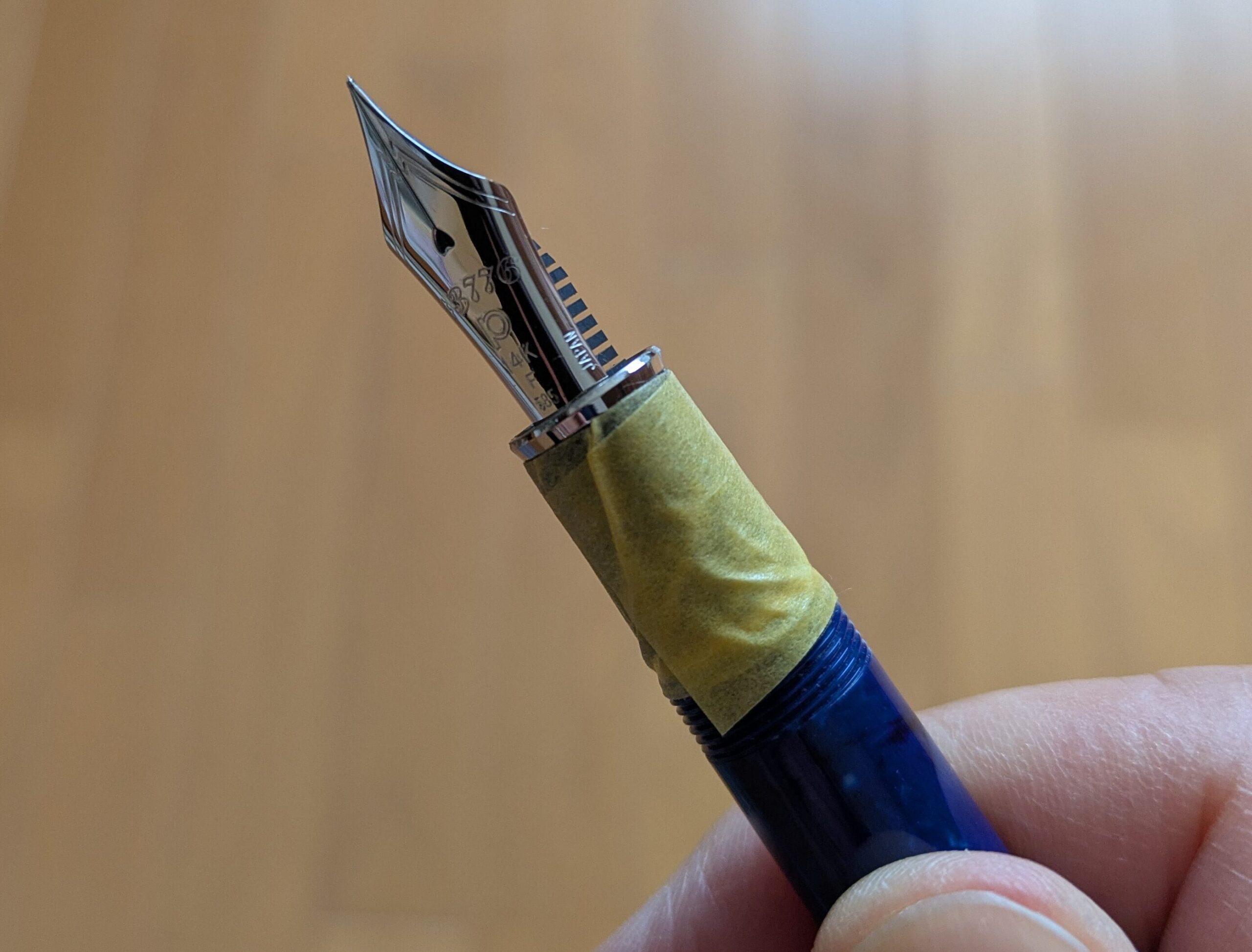 プラチナの万年筆 #3776 センチュリーの手持ちの近くの金属の部品に、青い錆みたいのものが付いてしまった。